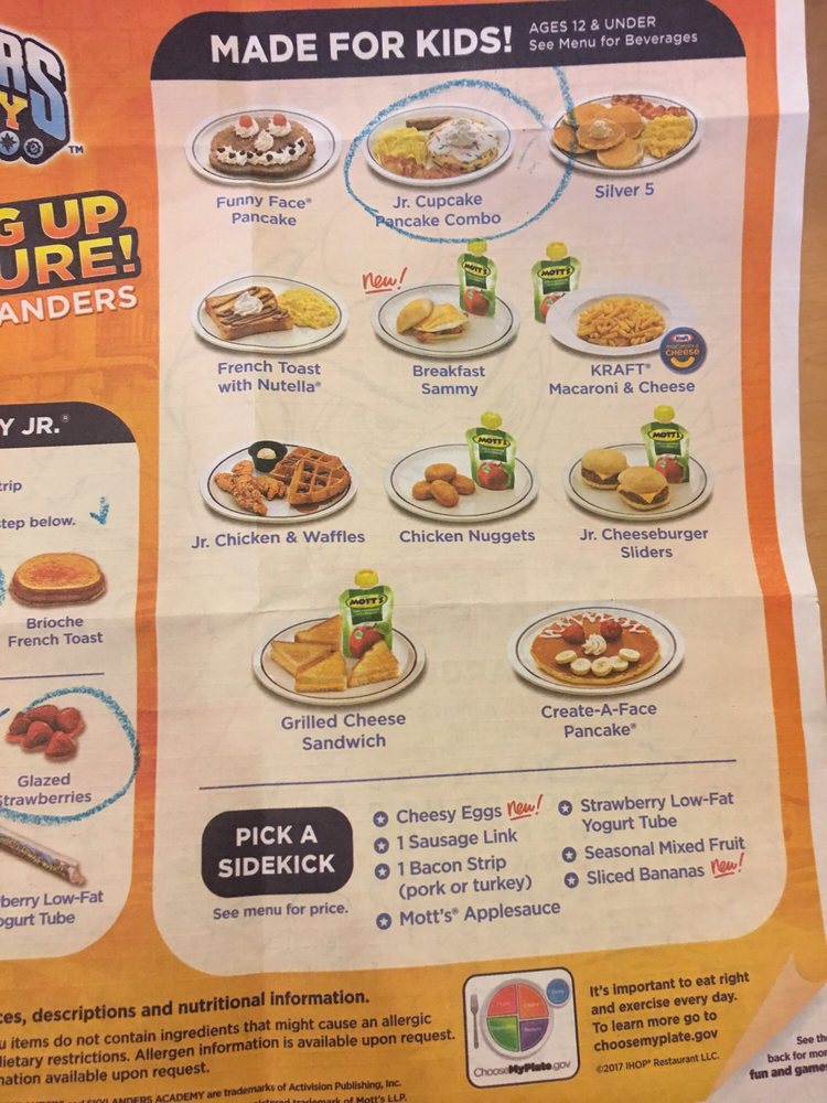 Choice of chocolate or buttermilk pancake filled with chocolate chips. Topped with whipped topping, a chocolate chip smile & fresh strawberry eyes.